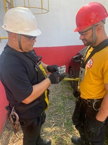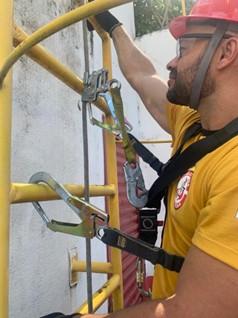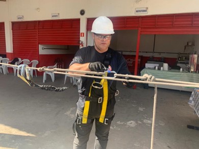 Inspeção no cinto de segurança, corda, trava quedas, mosquetão, talabarte, antes de iniciar as atividades com trabalho em altura.