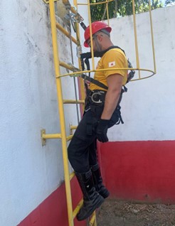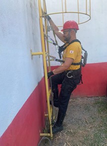 Acesso por escada marinheiro, sistema de retenção de queda, linha de vida, talabarte, cinto de segurança, o trabalhador deve estar apto para trabalho em altura conforme aprovação no ASO, atestado por um médico